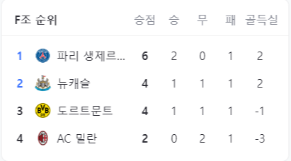 PSG는 뉴캐슬, 도르트문트, AC밀란과 함께 F조에 속해있고 현재 승점 6점으로 1위를 차지하고 있습니다.