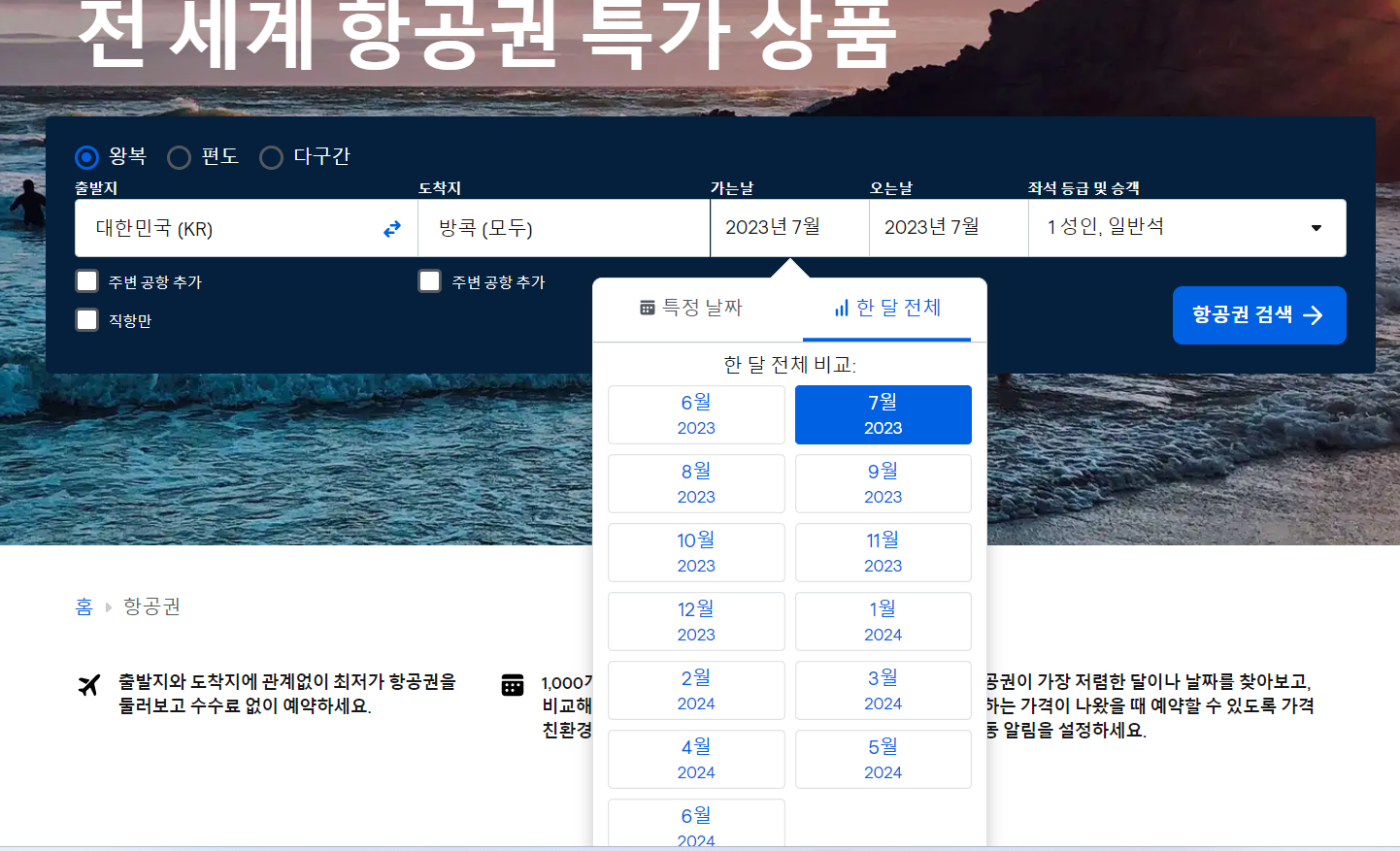 7월에 태국 방콕으로 여행을 갈 계획이 정해졌다면 우선 스카캐너 항공권 검색창에 출발지 인천, 도착지 방콕을 입력합니다. 다음은 여행 가는 날과 오는 날을 입력하면 되는데 최저가 검색을 위해 특정 날짜를 입력하지 말고 한 달 전체를 클릭합니다. 7월을 클릭하고 항공권 검색 버튼을 누릅니다.