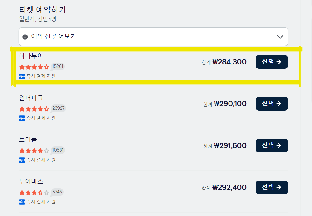 선택하기를 누르면 현재 해당 티켓을 구매할 수 있는 사이트들이 나옵니다.