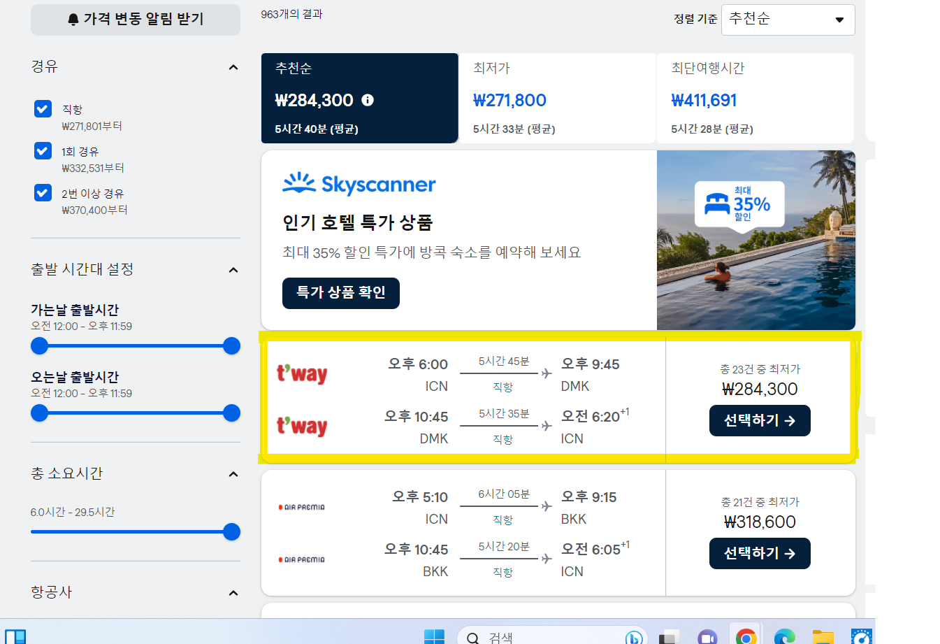 가장 먼저 스카이스캐너의 앱이나 홈페이지를 열어주고